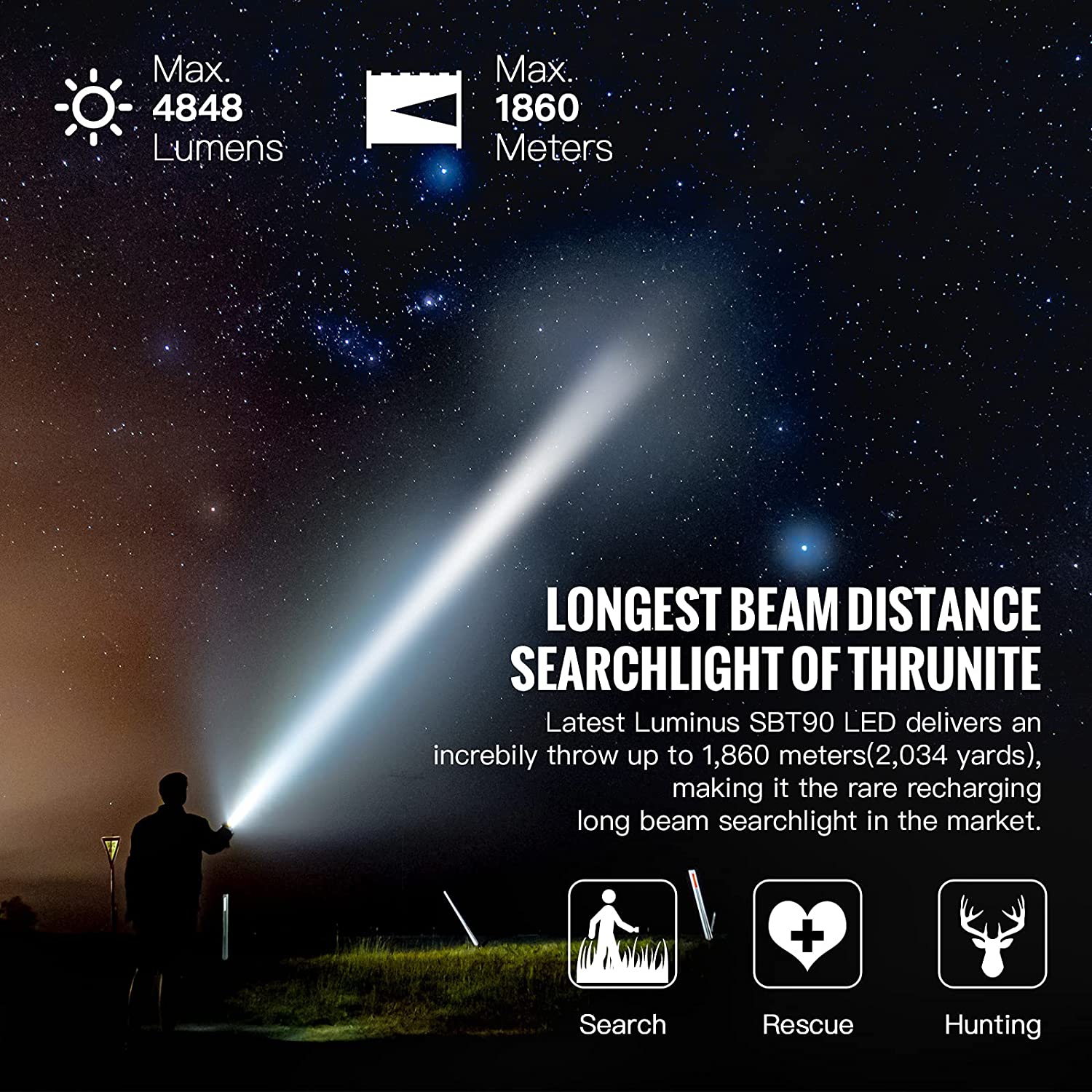 Product description: LED Searchlight, 1860 Meters / 2034 Yard Long Throw Beam Distance